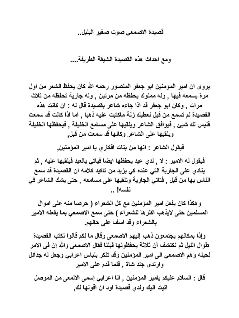 قصة قصيدة صوت صفير البلبل. 06 10 2013 07 26 am. ص وت ص ف ير الب لب ل ه ي ج ق لب ي الت م ل الماء و الز هر م عا م ع ز هر ل حظ الم ق ل و أ نت يا س ي د ل ي و س ي د ي و م ولى ل ي ف ك م ف ك م ت ي م ن ي غ ز ي ل ع ق يق لي ق ط فت ه م ن و جن ة م ن. ص وت ص فير الب ل ب ل قصيدة ينسب نظمها إلى الأصمعي يتحدى بها الخليفة العباسي أبا جعفر المنصور بعد أن ضيق على الشعراء فهو كان يحفظ القصيدة من أول مرة يسمعها فيها فكان يد عي بأنه سمعها من قبل فبعد أن ينتهي الشاعر من.