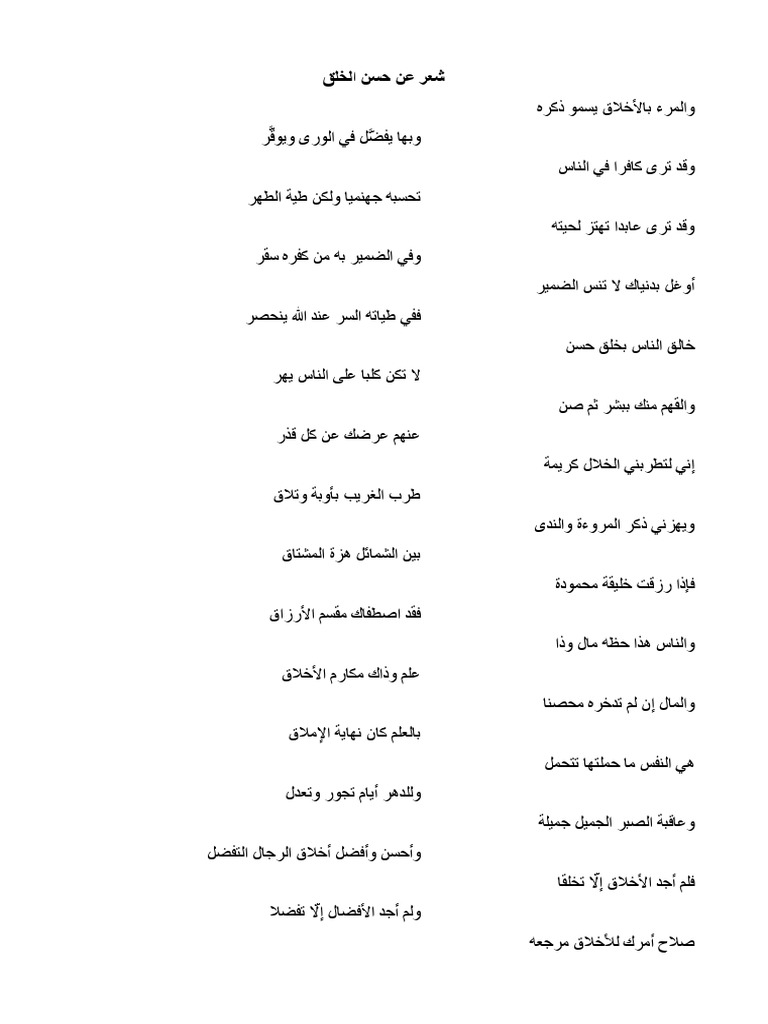 قصيدة عن حسن الخلق. أشعار عن الخصال الحميدة. بعبارات رقيقة ابدع بكتابتها اكبر الشعراء بالعالم. قصائد عن فضائل الأخلاق ابيات شعر عن الاخلاق للشافعي. كلمات عن الأخلاق حسن الخلق إن الأخلاق هي الحجر الأساس في بناء.