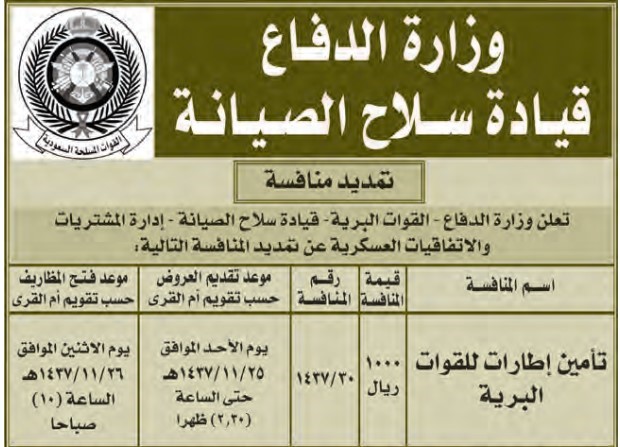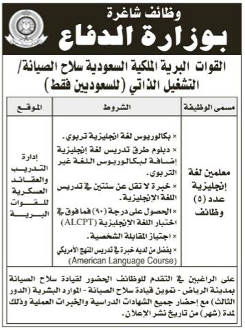 فعلى الراغبين في التقدم لهذه الوظائف الحضور لقيادة سلاح الصيانة بمدينة الرياض تموين قيادة سلاح الصيانة الموارد البشرية الدور الثالث مع إحضار جميع الشهادات الدراسية والخبرات العملية وذلك لمدة شهر من تاريخ نشر. مختلف الأحوال والظروف بكفاءة عالية. تعلن قيادة القوات البرية الملكية السعودية اللجنة المركزية لقبول طلبة القوات البرية عن فتح باب القبول والتسجيل في سلاح الصيانة لعدد 600 طالب أساسي و 100.