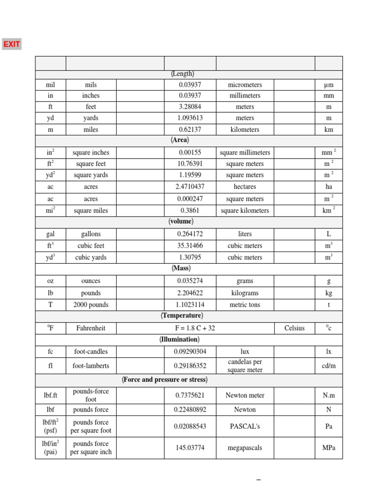جدول تحويل وحدات القياس